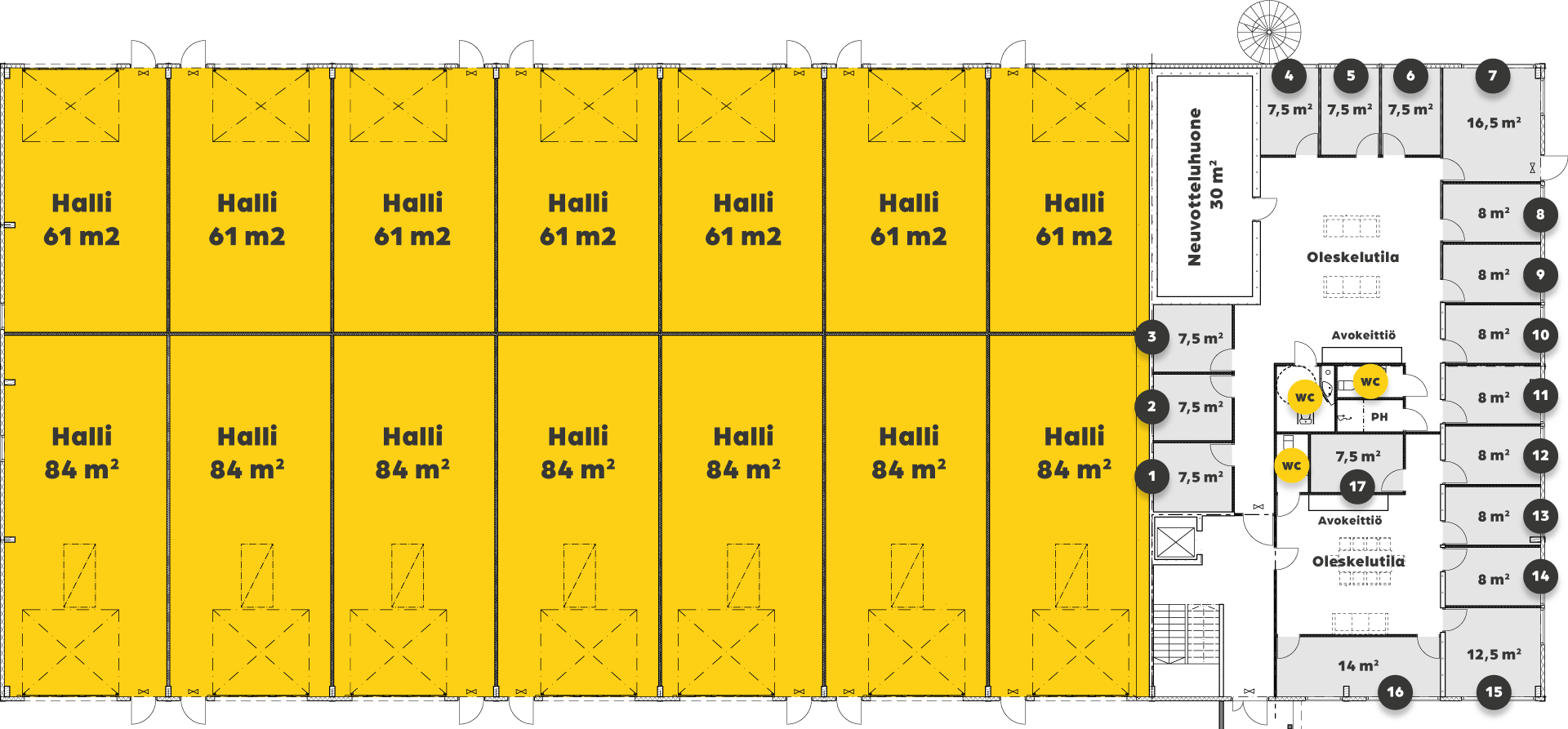 Toimistotiloja ja halleja on yhdisteltävissä ja muokattavissa tarpeiden mukaan. Tilat ovat jaettavissa haluttuihin kokonaisuuksiin yhdestä toimistohuoneesta suurempaan halli- ja toimistotilaa kattavaksi kokonaisuudeksi.