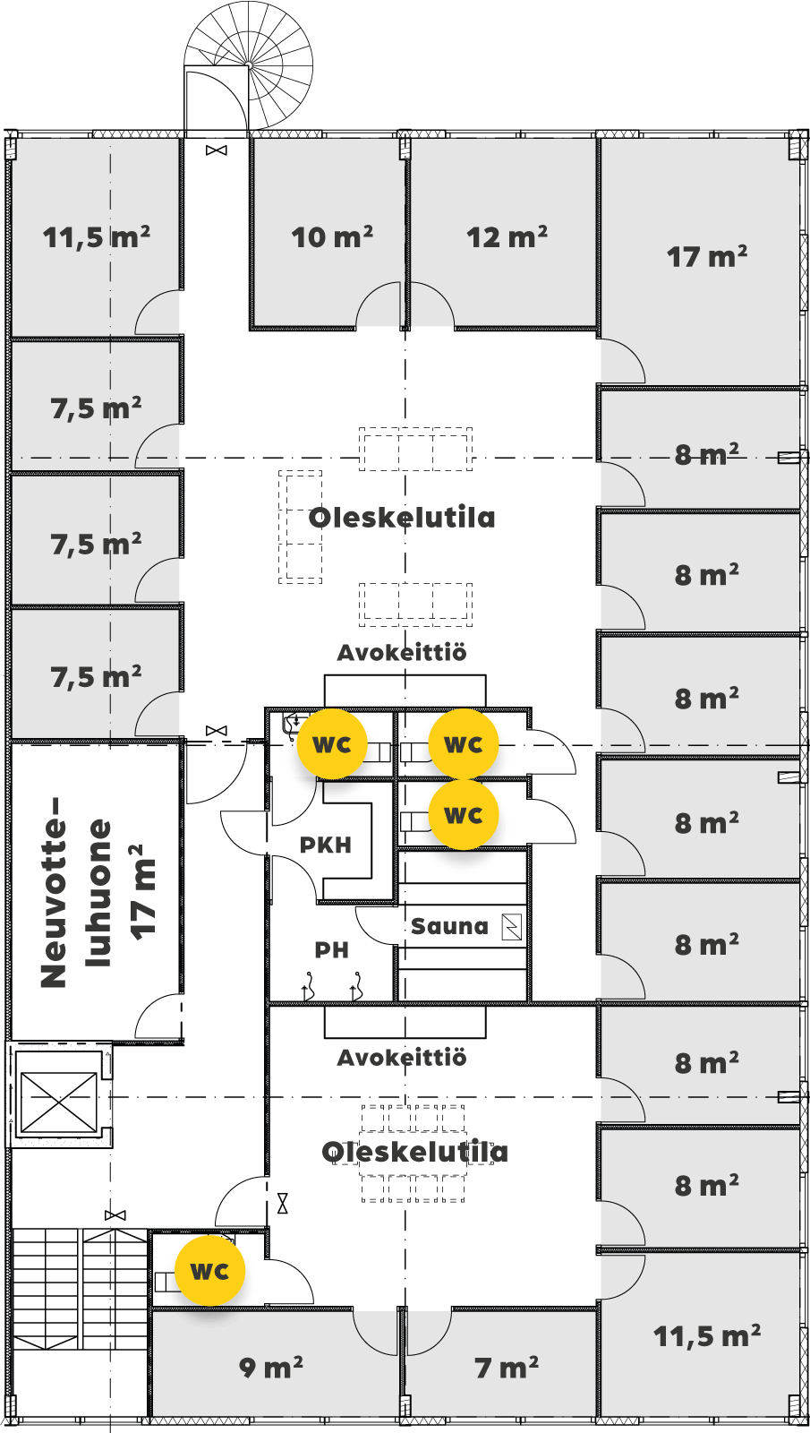 - Viihtyisien yhteiskäyttötilojen käyttöoikeus: WC:t, sosiaalitilat, neuvotteluhuone sekä oleskelu- ja keittiötilat.